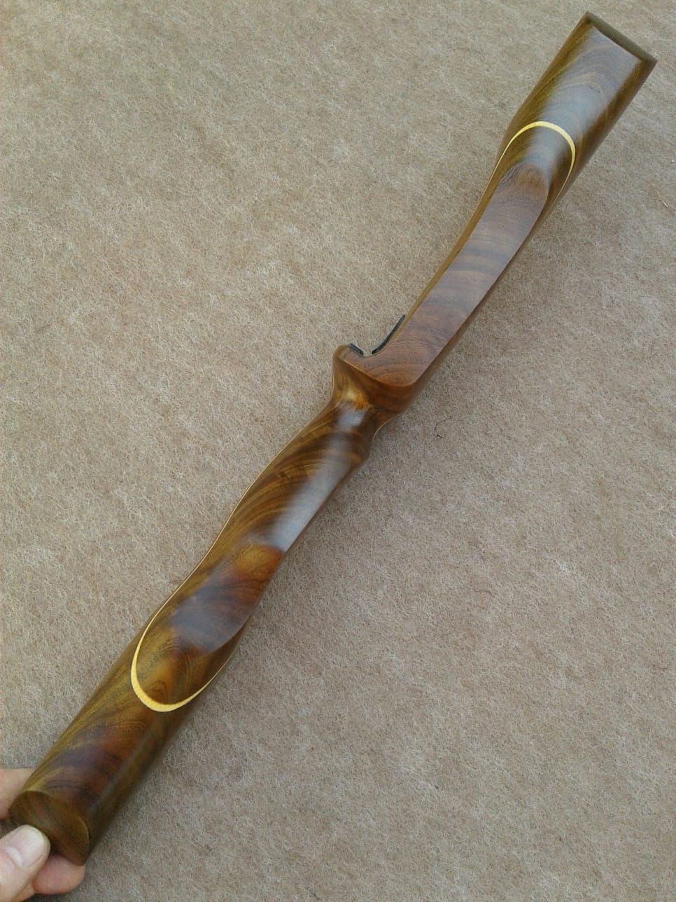 También reforzado con fibra de vidrio y chapas de maderas exóticas en la parte posterior de la empuñadura.
